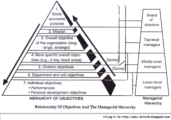 In many organizations objectives are structured in a hierarchy of importance. There are objectives within objectives. They all require painstaking definitions and close analysis if they are to be useful separately and profitable as a whole. The hierarchy of objectives is a graded series in which an organization’s goals are supported by each succeeding managerial level down to the level of the individual. The objectives of each unit contribute to the objectives of the next higher unit. Each operation has a simple objective which must fit in and add to the final objective. Hence no work should be undertaken unless it contributes to the overall goal.