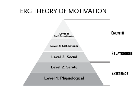 ERG i.e. Existence – Relatedness – Growth. According to him there are 3 groups of core needs as mentioned above. The existence group is concerned mainly with providing basic material existence. The second group is the individuals need to maintain interpersonal relationship with other members in the group. The final group is the intrinsic desire to grow and develop personally. The major conclusions of this theory are :